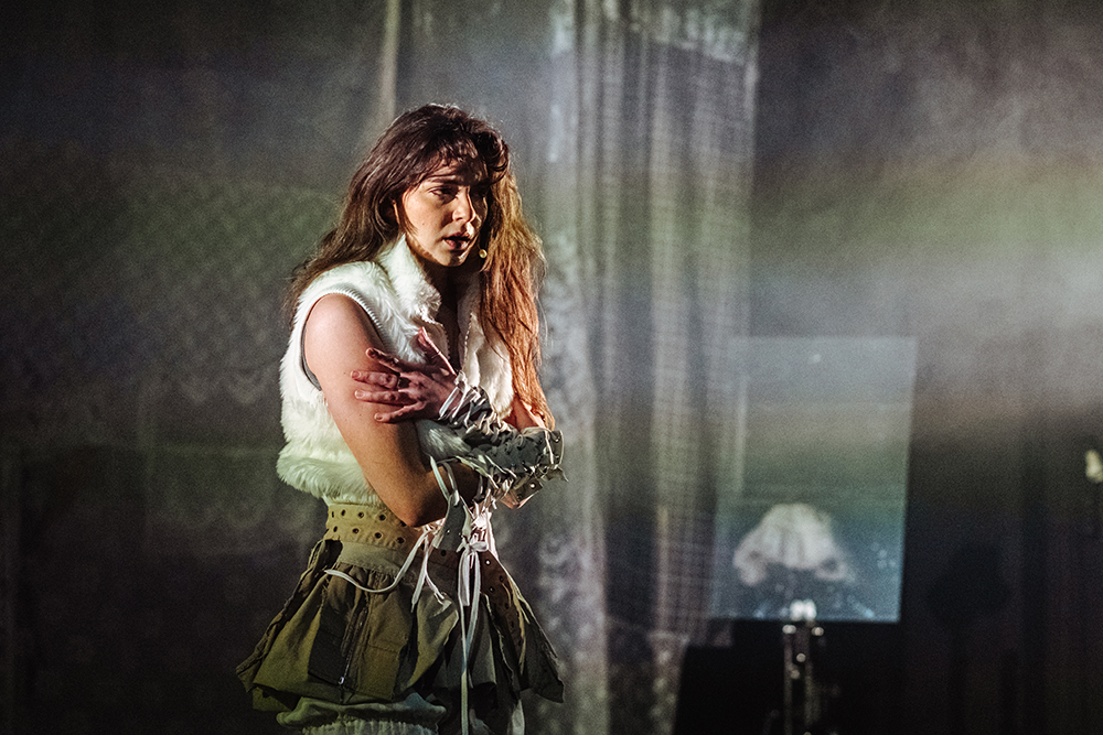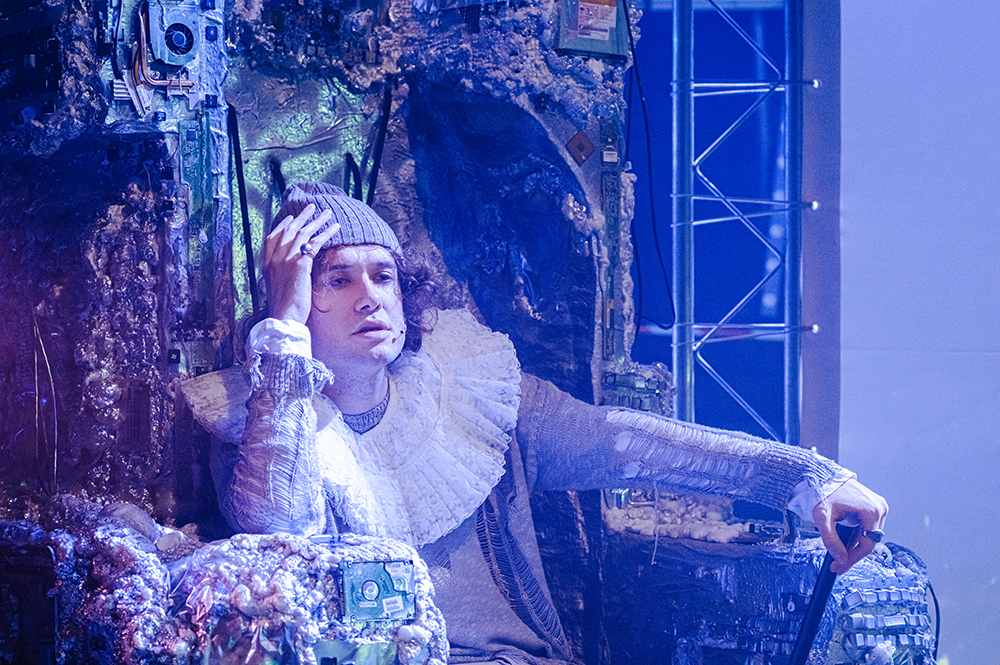 Owo „wyłamanie”, skutkujące niemożnością poskładania świata w dającą się objąć i zrozumieć całość, znajduje swój wizualny odpowiednik w scenografii Sandry Stępień. Przestrzeń wygląda, jakby pozostawała w stanie montażu albo w permanentnej gotowości do reorganizacji – a może nawet wymagała ponownego „nastawienia”. Rozwieszone w głębi sceny, na całej jej szerokości, staromodne firany przesłaniają umieszczony z tyłu duży ekran. Wprowadza to nie tylko estetyczny zgrzyt, lecz także odsyła do napięcia pomiędzy tym, co ukryte, a tym, co ujawniane: między prywatnością a inwigilacją. Przed ekranem, po lewej stronie, ustawiono tron przypominający konstrukcję ze sprasowanych elektrośmieci. Obiekt ten przywodzi na myśl estetykę dystopijnego cyberpunku, dobitnie zwracając uwagę na związek technologii z władzą. Z prawej strony sceny biegnie pas zielonej wykładziny, który – poprzez umieszczony przed proscenium podest – prowadzi do niewielkiej „wyspy” z zestawem VR. W ten sposób wyrażane jest towarzyszące postaciom pragnienie ucieczki od nieprzyjaznej, rozchwianej rzeczywistości i zastąpienia jej znośniejszą fikcją.