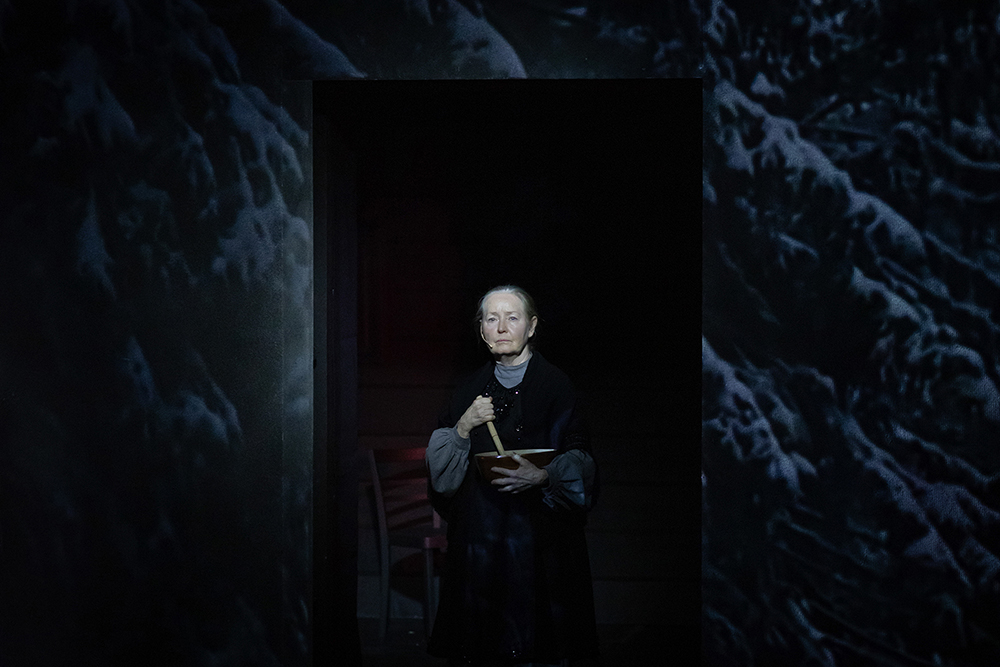 „Wyspa” inspirowana jest prawdziwą historią przodków Eugenii Balakirevy, reżyserki i autorki tekstu. Jej rodzina – czego dowiadujemy się z opisu spektaklu – pochodzi z białoruskiej wsi Pachomowo, która w latach sześćdziesiątych ubiegłego wieku została wysiedlona i zalana w ramach budowy systemu wodnego Wilejka-Mińsk. Reżyserka opowiada więc o własnym, choć odziedziczonym, doświadczeniu tułaczki w wyniku utraty „swojego” miejsca. Wykorzenienie prowokuje trudną do zdefiniowania tęsknotę za czymś, nawet jeśli nigdy tego nie poznaliśmy. Nostalgiczny, a nawet elegijny nastrój udziela się widzowi krakowskiego przedstawienia od samego początku. Rozpoczyna je emisja quasi-przyrodniczego dokumentu o powstawaniu i geologicznym zróżnicowaniu wysp oraz groźbie ich „zniknięcia” w związku z topnieniem lodowców i podnoszącym się poziomem wód. Film przybliża również historię kilku nie-miejsc: nieistniejącej już rumuńskiej wsi Geamăna, porzuconej przez Stany Zjednoczone „lodowej” bazy wojskowej Camp Century oraz opuszczonej japońskiej wyspy Hashima. Gdy rozpocznie się właściwa akcja, a światło (reżyseria świateł: Monika Stolarska) wydobędzie z mroku sylwetki dwóch pogrążonych w myślach bohaterek, Haliny i Ali, przedmiotem ich dyskusji stanie się pamięć – jej ograniczenia, zwodniczość i nietrwałość. Ala, tak w tej scenie, jak i przez całe przedstawienie, próbuje przypomnieć sobie słowa piosenki z dzieciństwa: „Coś tam… nanana… nanana. Jak ona się zaczyna? Nie pamiętam. Kiedy Igor był mały, to mu śpiewałam, a teraz jakbym się nie starała… Słowa mi uciekają. Melodię pamiętam, a słów nie”. Jej próby mierzenia się z niepamięcią przerywa głośne pukanie do drzwi. Dopiero w kolejnej scenie – rozgrywającej się dwa tygodnie później, poprzedzonej refleksją tajemniczego głosu z offu o źródłach tęsknoty – poznamy przybysza, który stanął w jej drzwiach.