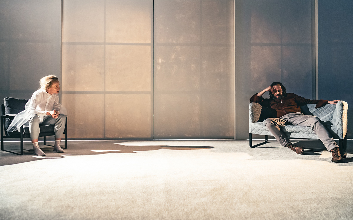 Leontes – siedząc obok żony w niechlujnym stroju (scenografia i kostiumy: Magdalena Mucha), z przetłuszczonymi, długimi włosami – wydaje się zniecierpliwiony: jakby został przyciśnięty do muru, a spotkanie terapeutyczne było częścią postawionego mu ultimatum. Pozornie spokojny, wręcz nonszalancki, pozostaje jednak napięty i nerwowy. Sam, choć z wyraźnym wysiłkiem, określa przyczynę, która sprowadziła go w to miejsce. Mówi o swojej winie wobec żony; o własnej niegodziwości i destrukcyjnej podejrzliwości, która doprowadziła do jej śmierci. Skoro siedzą obok siebie, wydaje się, że to określanie ma charakter metaforyczny. Skoro Hermiona umarła, a znajduje się obok męża, jest może – z żalu za utraconą miłością i zaufaniem, albo w obliczu zbliżającej się utraty dziecka, które jeszcze trzyma przy piersi – osobą umarłą za życia? Kiedy mówi, Leontes jej przerywa: udziela odpowiedzi za żonę, raz po raz wtrąca coś od siebie. Czasem używa przy tym angielskich słów, celnie określających jego stosunek do poruszanej sprawy. Jest przecież królem, mężczyzną, małżonkiem: jego słowa mają moc sprawczą, a decyzje – stają się prawem.
